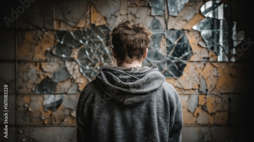 © VisualFolioZone, Naklejka premium A solitary figure in a gray hoodie stands with back turned, facing a cracked wall with shattered glass,