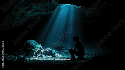 Obraz premium A Solitary Figure Kneels in a Dark Cave Illuminated by Breakthrough Light