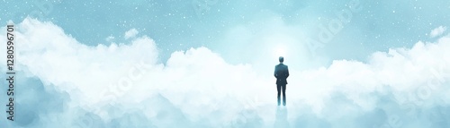 Fototapeta premium A solitary figure stands amidst clouds, evoking a sense of introspection,...