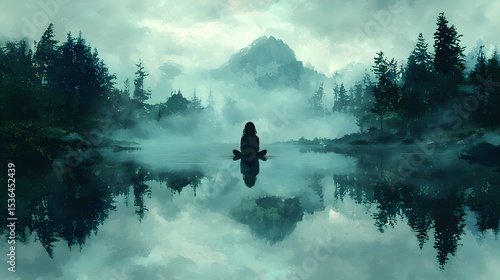 Fototapeta premium A solitary figure stands in a tranquil lake at twilight, reflecting the...