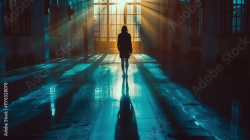 © PuriStudio, Obraz premium A solitary figure stands in an eerie, illuminated space, bathed in beams of light filtering through large windows, casting dramatic shadows on the floor