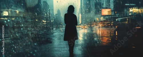 Fototapeta premium A solitary figure stands in the rain, reflecting on the vibrant city lights,...
