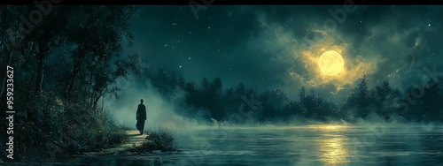 Fototapeta premium A solitary figure walks along a misty lakeside path under a bright full moon...