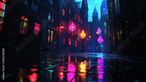 Fototapeta premium A solitary figure walks down a wet, cobblestone street in a city at night. Neon signs and streetlights cast a colorful glow on the buildings and puddles.