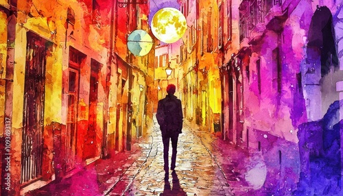 Fototapeta premium A solitary figure walks through a narrow, cobblestone street under a full moon.