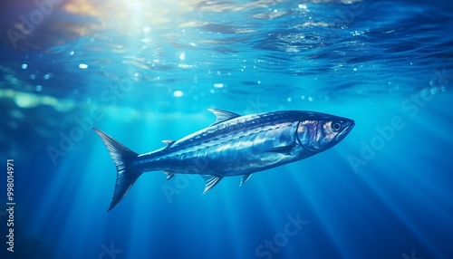 Fototapeta premium A solitary fish swims gracefully in clear ocean waters illuminated by sunlight rays