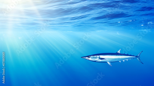 Fototapeta premium A solitary fish swims through blue, white, and green water, illuminated by...
