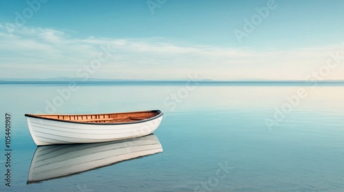 © ArtCookStudio, Naklejka premium A solitary fishing boat floating on calm waters at dawn