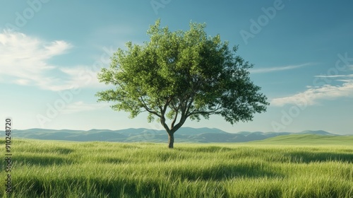 © Nathan, Obraz premium A solitary green tree stands tall in an expansive grassy field under a blue sky.
