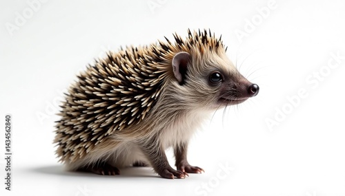© Nimman, Fototapeta premium A solitary hedgehog, facing right, against a stark white backdrop, brown, wild