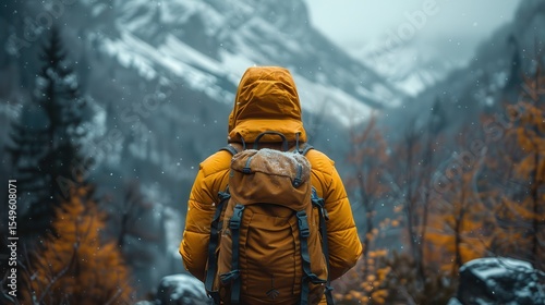 Fototapeta premium A solitary hiker clad in a bright yellow jacket stands before majestic mountains, capturing the essence of adventure and the beauty of nature in winter's embrace.