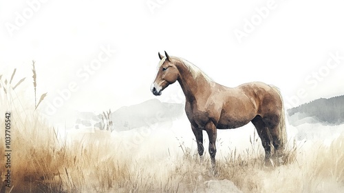 © Terablete, Naklejka premium A solitary horse stands gracefully in a lush green field under a bright sky beside gentle rolling hills