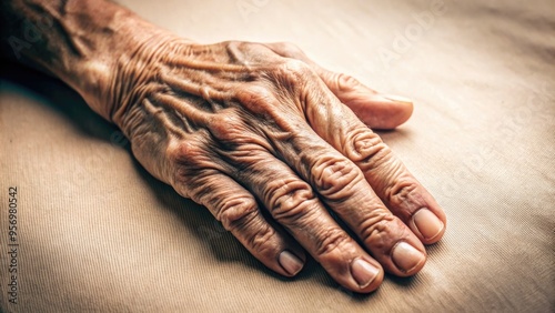 © Man888, Fototapeta premium A solitary human hand, fingers slightly curled, with visible veins and wrinkles, rests on a blurred neutral-colored background, conveying a sense of intimacy and vulnerability.