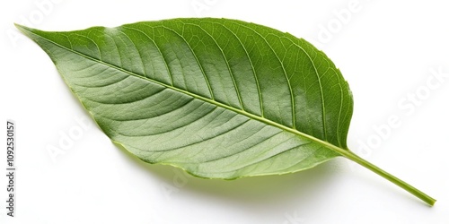 © Kingphet, Obraz premium A solitary large green leaf on a white background with subtle shadows and depth, botanical, nature, isolated, single