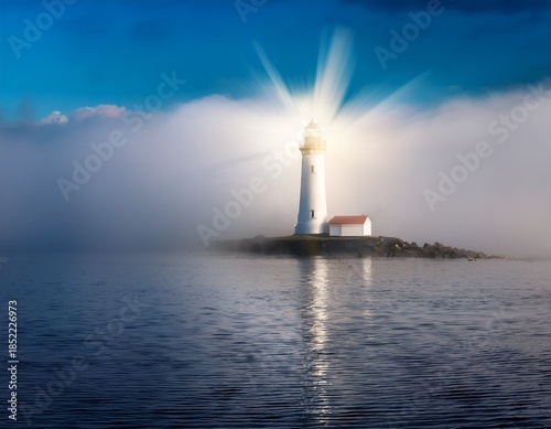 Fototapeta premium a solitary lighthouse emits a bright beam of light through dense fog over...