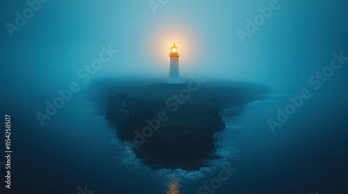 © aritha, Fototapeta premium A solitary lighthouse shines through fog, guiding ships in a tranquil sea.