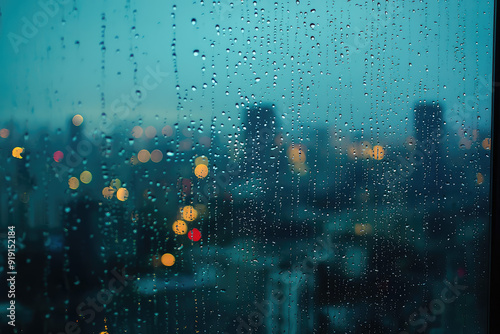 Obraz premium A solitary moment captured in time, where raindrops whisper tales against the glass, blurring the vibrant city lights below.