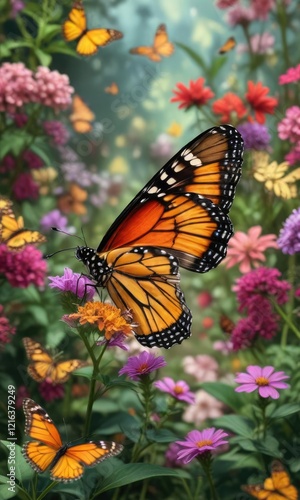 Naklejka premium A solitary monarch butterfly perched on a flower petal in a garden full of...