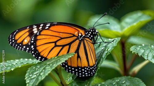 © Adisorn, Fototapeta premium A solitary monarch, vibrant wings against a backdrop of emerald green.