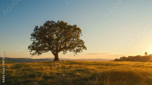Fototapeta premium A solitary oak tree in a rural landscape, its branches outlined against the setting sun's warm light