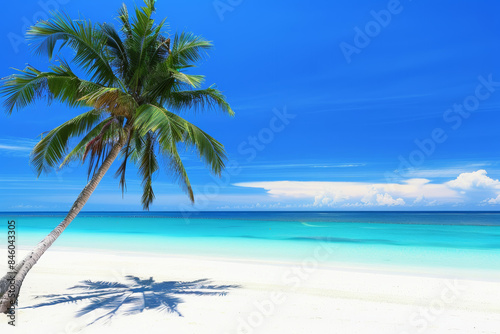 Fototapeta premium A solitary palm tree casting a shadow on a pristine white sandy beach under a bright blue sky