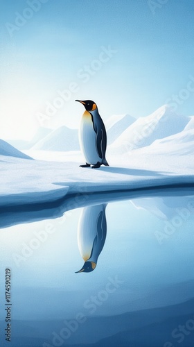 Fototapeta premium A solitary penguin stands on ice, reflecting in calm waters under a serene...