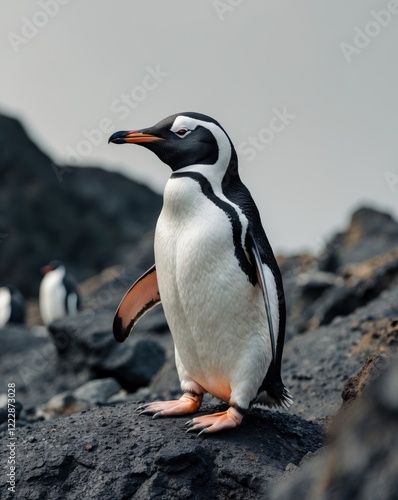 Naklejka premium A solitary penguin stands proudly on rocky terrain, showcasing its...