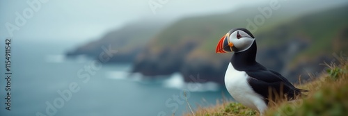 Naklejka premium A solitary puffin perched on a misty coastal cliff surveys the tranquil expanse of the ocean with a thoughtful gaze