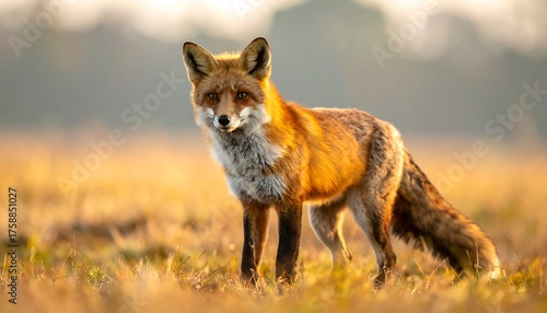 © Kuri, Naklejka premium A solitary red fox, bathed in golden sunlight, gazes directly at the viewer while standing in a field of dried grasses. Background is blurred