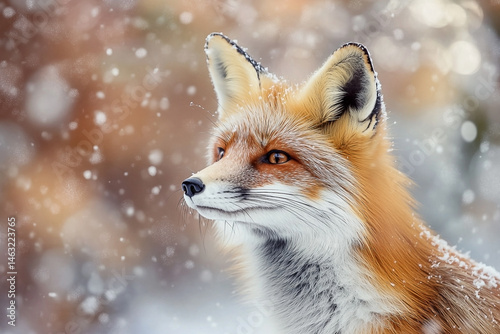 © Khozainuz, Fototapeta premium A solitary red fox gazes into the winter landscape amidst falling snowflakes