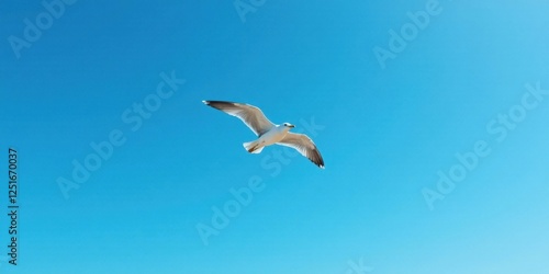 © Sumrit, Obraz premium A solitary seabird glides effortlessly against a vibrant azure sky, wings outstretched in graceful flight, a breathtaking display of avian freedom and natural beauty.