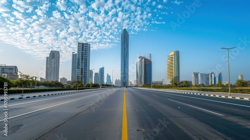 © Chandara, Fototapeta premium A solitary skyscraper surrounded by empty streets and a clear sky.