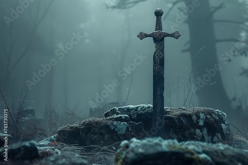 Naklejka premium A solitary sword rises from a rock in a mist-covered forest, evoking tales of...