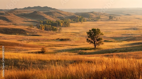© Olga, Obraz premium A solitary tree in a field with a distant hill and surrounding hills