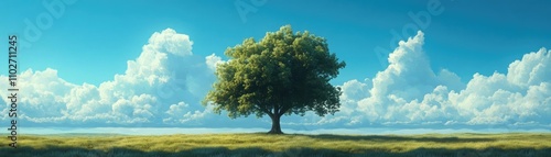 © Woranittha, Fototapeta premium A solitary tree in the middle of a grassy plain, with a vast sky above