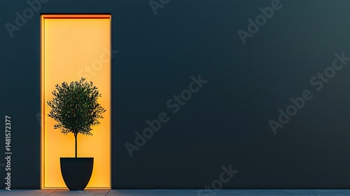 © Berkah1789, Fototapeta premium A solitary tree inside an illuminated wall niche appears serene