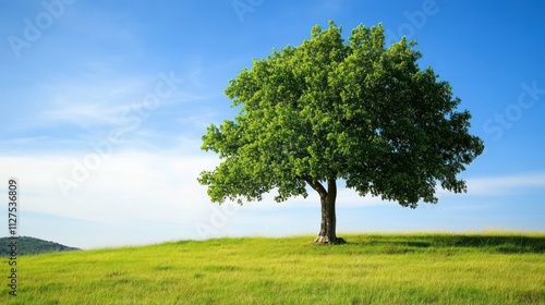 Fototapeta premium A solitary tree on a grassy hill under a clear blue sky, symbolizing nature's...