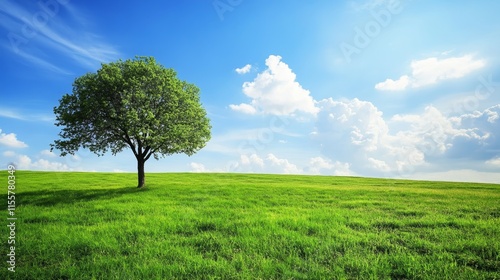 © Quality Assets, Obraz premium A solitary tree on a lush green hill under a bright blue sky with fluffy clouds.