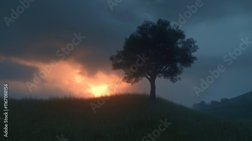 © kept, Fototapeta premium A solitary tree silhouetted against a vibrant sunset on a grassy hill.