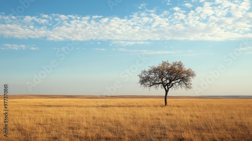 Obraz premium A solitary tree stands against a vast field of dry grass, evoking themes of...