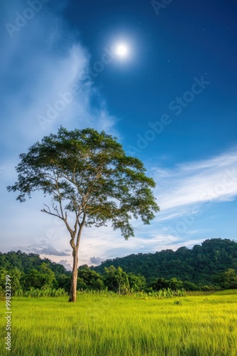 Obraz premium A solitary tree stands gracefully under a glowing moon in a lush green field...