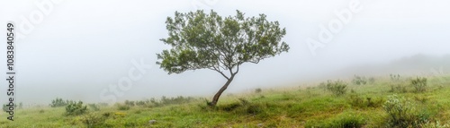 © Trionorejo, Fototapeta premium A solitary tree stands in a foggy landscape, creating a serene and tranquil atmosphere.
