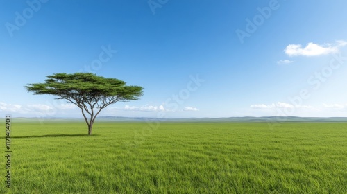 © artzone, Obraz premium A solitary tree stands in a vast green field under a clear sky.