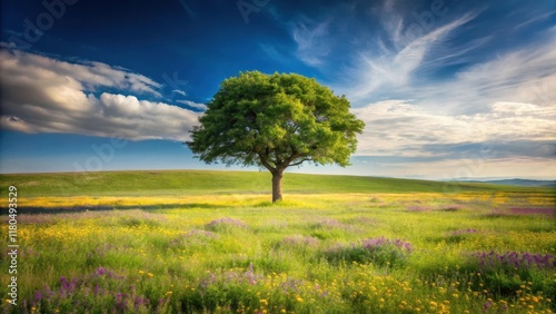© Jotch, Fototapeta premium A solitary tree stands in a vast, open landscape surrounded by lush greenery and wildflowers , wilderness