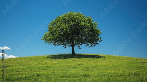 © Ta, Obraz premium A solitary tree stands in a verdant field under a clear blue sky.
