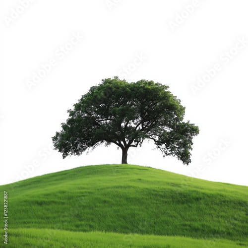 © Chanagun, Obraz premium A solitary tree stands majestically atop a vibrant green hill, showcasing nature's beauty in a minimalist landscape. The scene evokes feelings of tranquility and harmony.