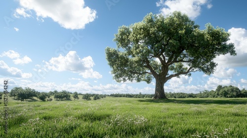 © BirD, Fototapeta premium A solitary tree stands majestically under a clear blue sky in a vast green meadow.