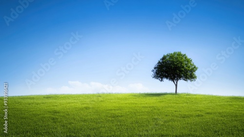 © KumCup, Obraz premium A solitary tree stands on a grassy hill under a clear blue sky with a few distant clouds.