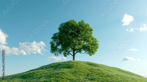 © Oranuch, Obraz premium A solitary tree stands on a lush green hill under a clear blue sky, symbolizing nature's beauty and tranquility.