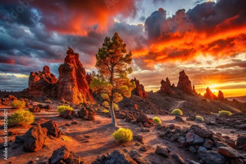 © Urenus Photos, Fototapeta premium A solitary tree stands resilient amidst fiery sunset hues, casting long shadows across a rugged volcanic landscape of dark rocks and earthy tones, creating a dramatic and awe-inspiring scene.